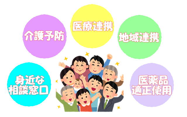 高齢化が著しく進行しているなかで、高齢者が住み慣れた地域で自分らしく暮らしていけるような社会をつくっていく必要があります。そのなかで、薬局は「健康サポート機能」を備え、ほかの介護・医療機関と連携して医療・介護・予防・生活支援を提供し社会に貢献することが求められています。